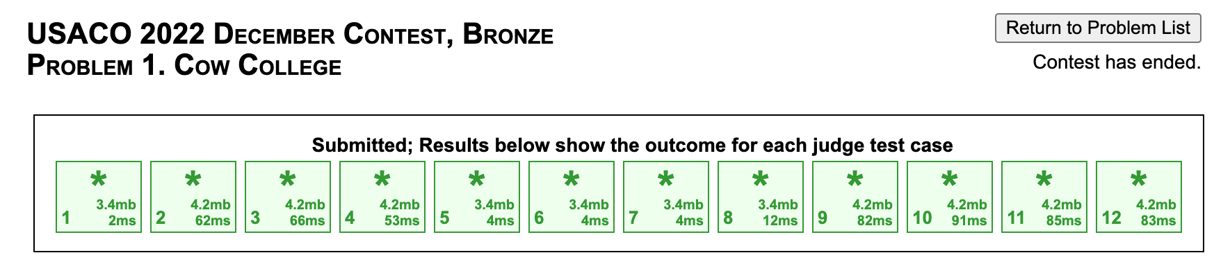 For example, Cow College has 1 sample test case (test case 1) and 11 non-sample test cases (test cases 2-12). For each of test cases 2-12 you get correct, you earn 333.333/11=30.3030333.333 \dots/11 = 30.3030\dots points.